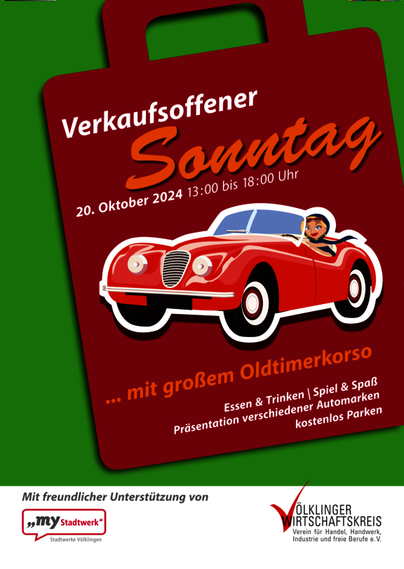 Information zum Brückentag am Freitag, den 16. August 2024 Am 20. Oktober ist es endlich wieder soweit: Am Sonntag kommen aus dem ganzen Saarland und Umgebung alle Oldtimerfreunde zusammen. Im Rahmen des „Herbsttages“ des verkaufsoffenen Sonntags von 13:00 bis 18:00 Uhr findet auch in diesem Jahr der 22. Völklinger Oldtimer-Korso statt. Im Anschluss an den […]
